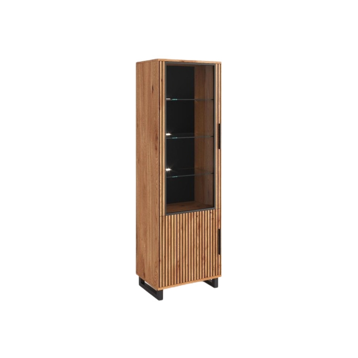 Optional interior lighting (sold separately) allows you to create a striking display and highlight the items placed inside. With its slim silhouette, the cabinet works well in a living room, dining room, or home office, introducing a refined blend of natural wood and minimalist detailing.