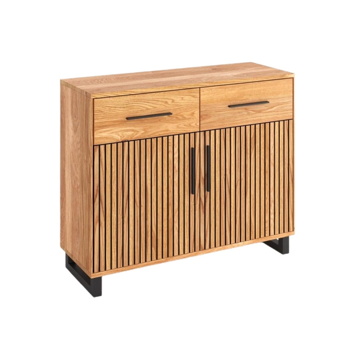The Paula 2D2S Sideboard by Meble Hugon, measuring 85 cm in height, 105 cm in width and 40 cm in depth, is a compact piece that blends natural wood with modern industrial touches.