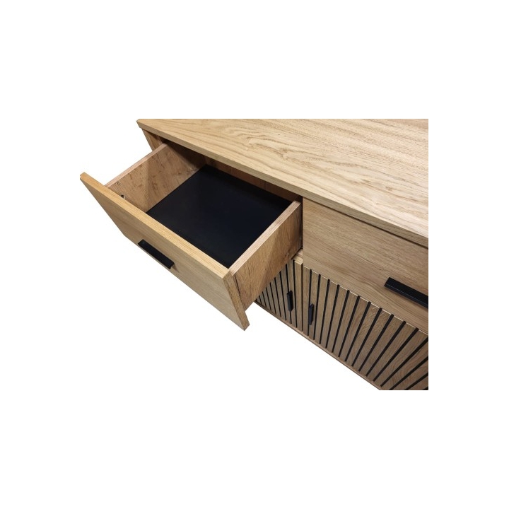 The upper section includes two drawers with metal handles that add a strong visual accent. Below them is a pair of doors with full acoustic-panel fronts featuring vertical grooves and partly made of solid wood, giving the fronts a three-dimensional texture. The doors are equipped with a Soft-Close mechanism, ensuring smooth and silent operation for everyday comfort.