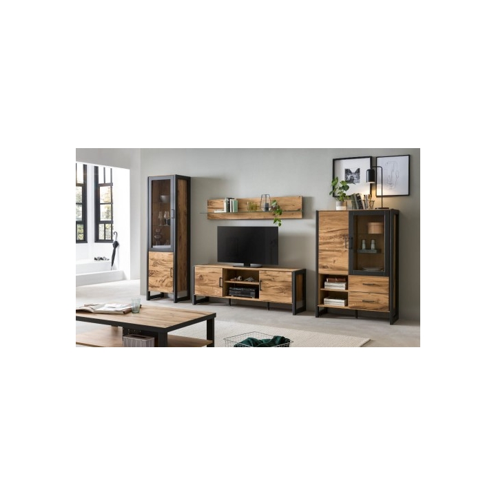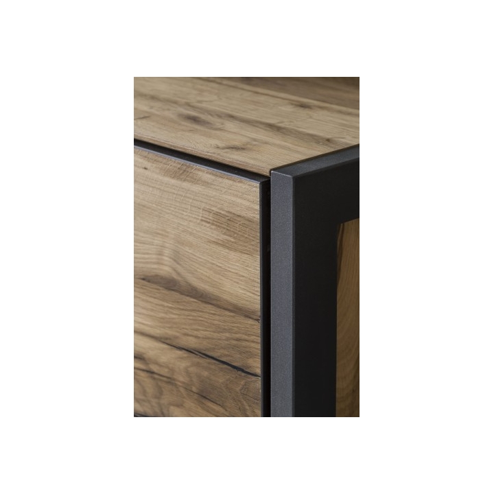 The slim structure stands on black metal legs, adding visual lightness and emphasising the contemporary look. The cabinet includes two doors—one made of glass, revealing two glass shelves for displaying décor, and the other made of veneered board in a natural oak tone, concealing a board shelf. This closed section provides space to store items you want to keep within reach but out of sight.
