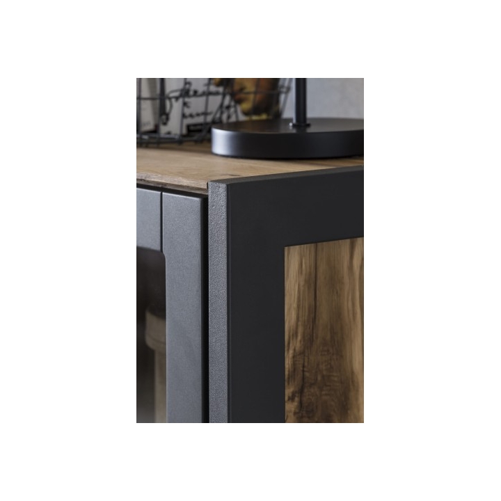 The Janne Low Display Cabinet 6D3S by Meble Hugon, measuring 141 cm in height, 158 cm in width and 40 cm in depth, stands out with its solid construction, substantial form, and the combination of oak veneer with bold black metal accents.