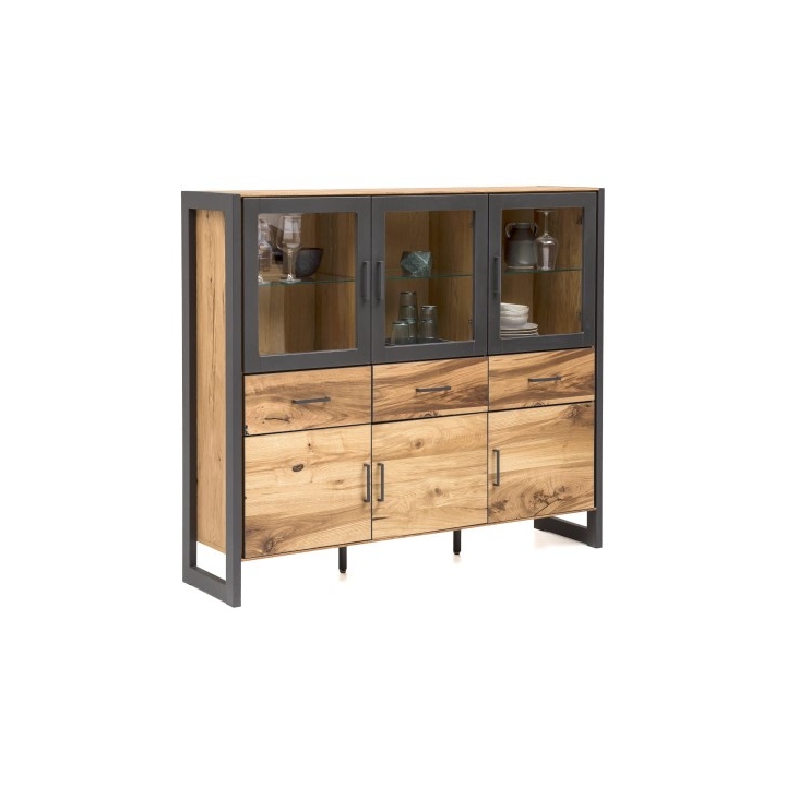 The robust structure rests on stable black metal legs, which also form a framing detail around the furniture, enhancing its loft-inspired character and adding a strong visual contrast. The warm tone of the oak veneer gives the piece a welcoming appearance, while its minimalist form allows it to fit seamlessly into spacious living rooms, dining rooms, or home offices.