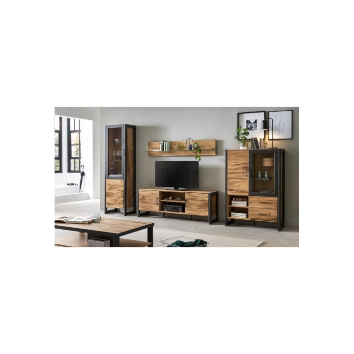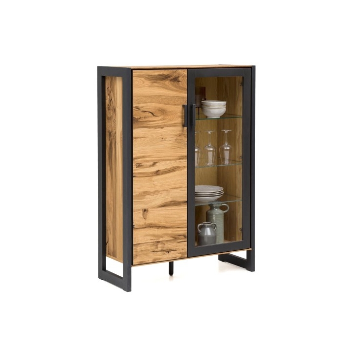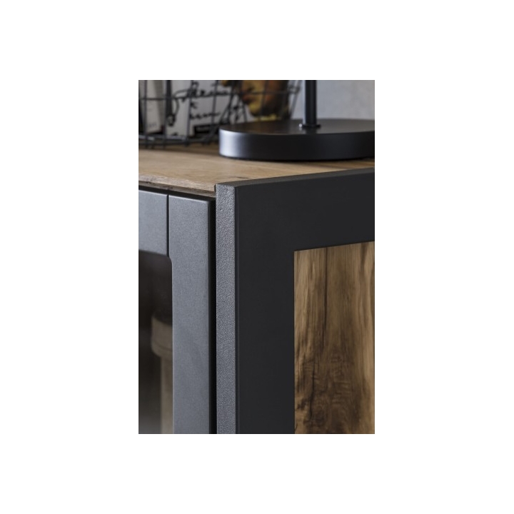 The cabinet’s structure rests on black metal legs, which also frame the furniture, adding a strong visual contrast and reinforcing the loft-inspired character of the Janne collection. The combination of materials—glass and oak veneer—emphasises the modern aesthetic, making this piece an original choice for the living room, dining room, or home office.