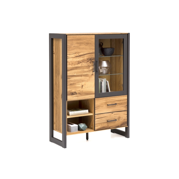 The sideboard stands out with its asymmetrical front layout. On one side, glass doors reveal two glass shelves, ideal for showcasing decorations. On the other side, a full veneered front conceals three practical shelves. Completing the interior are two spacious drawers and an open compartment with an oak-coloured shelf, providing a convenient spot for items you want to keep within reach.