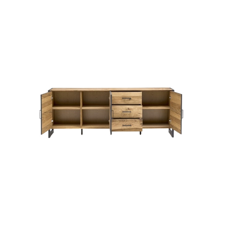 The Janne 208 3D3S Sideboard by Meble Hugon, measuring 81 cm in height, 208 cm in width and 40 cm in depth, is a large, solid piece that combines oak veneer with bold loft-inspired accents.