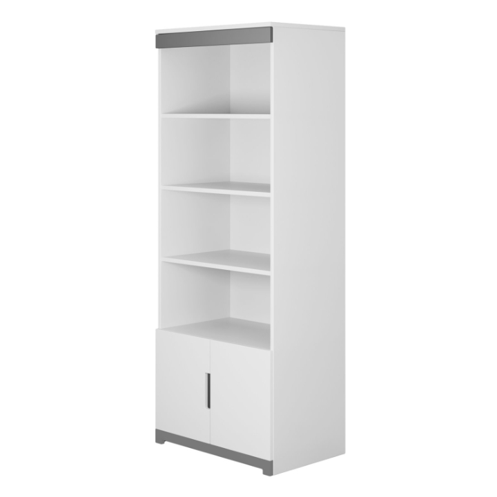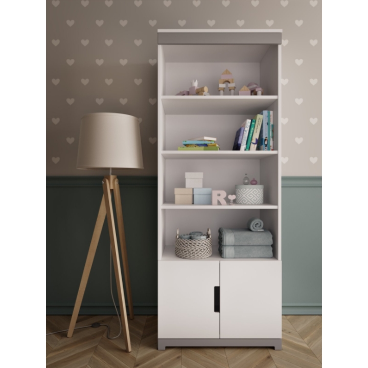 The bookcase offers a functional storage layout that helps maintain order. The upper section consists of four open shelves measuring 66.4 x 29 x 41 cm, ideal for books, educational materials, and decorative items. The lower section features a closed cabinet designed for items that should remain out of sight. The cabinet front is made of MDF lacquered with ecological, child-safe paints. The bookcase is finished in white with a distinctive grey decorative accent.