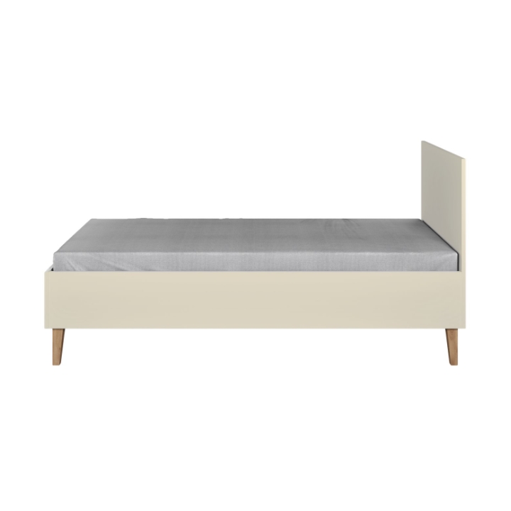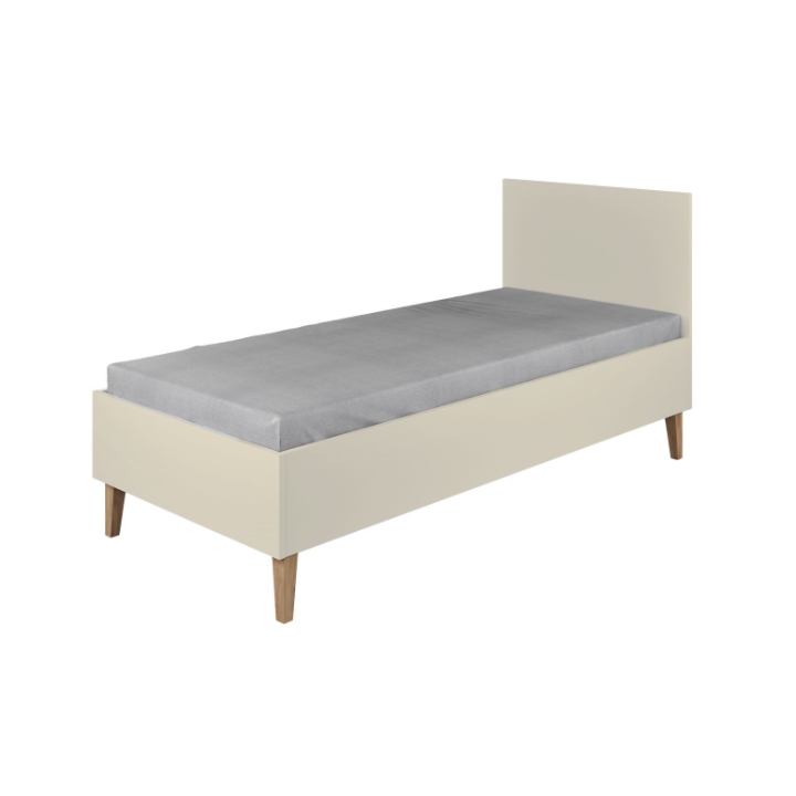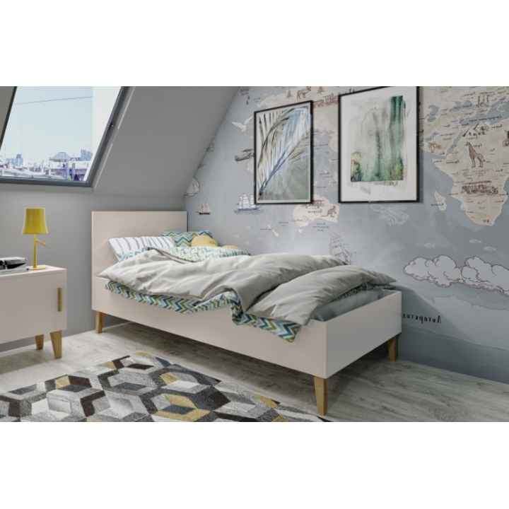 The Kubi bed features a simple, minimalist form combined with natural accents. With overall dimensions of 184 cm in length, 84 cm in width, and 92 cm in height, it offers a sleeping surface of 180 × 80 cm. The structure is made from solid 18 mm furniture board, ensuring stability and durability. A distinctive element of this model is the tall legs made of solid oak wood, finished with a clear, eco-friendly lacquer.