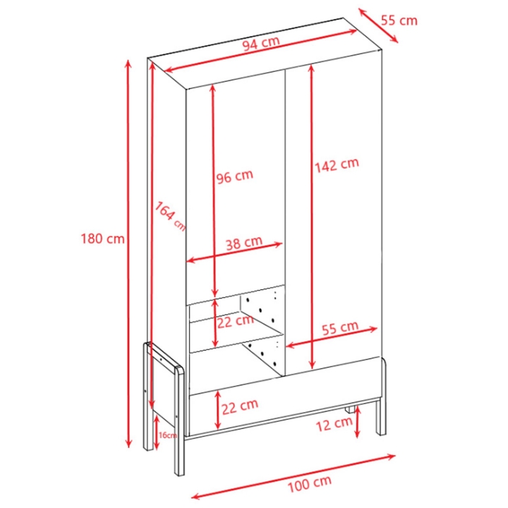 The Victor wardrobe is a spacious storage unit designed to organise clothing in a children’s or teenager’s room. It measures 100 cm in width, 180 cm in height, and 55 cm in depth. The structure is made from white 18 mm laminated board combined with solid oak wood. The raised, lacquered oak legs form a stable base, give the piece a lighter appearance, and make it easier to clean the floor underneath.