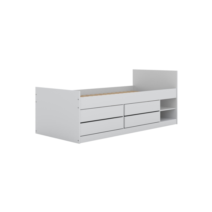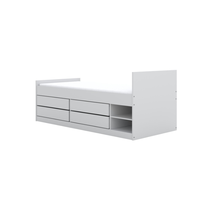 The structure has been carefully designed to combine a comfortable sleeping area of 90 × 200 cm with an expanded storage zone, making it an excellent choice for smaller interiors.