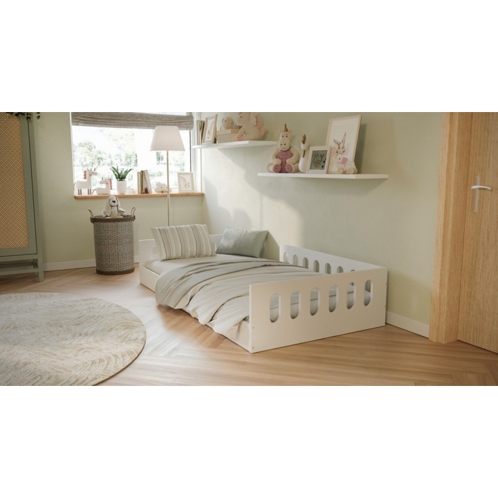 The Timon children’s bed measures 163.6 cm in length, 86 cm in width, and just 39 cm in height, offering a comfortable 160×80 cm sleeping surface. Its low structure allows children to climb in and out independently, making it ideal for toddlers transitioning from a crib.