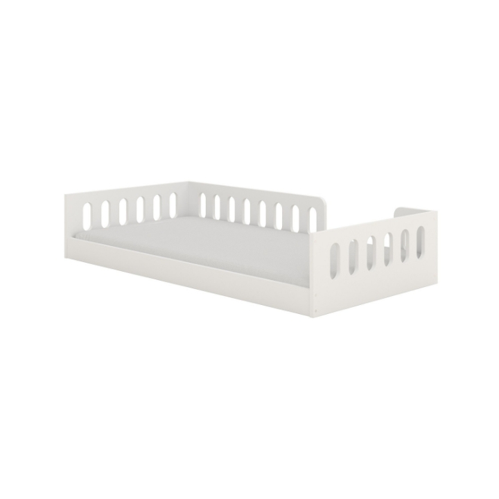 The clean white design is enhanced with decorative oval cut-outs in the side panels, adding a modern and airy character while maintaining a soft, child-friendly appearance.
