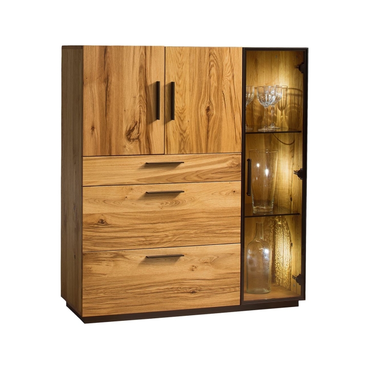 Moreno IV chest of drawers is a stylish piece of furniture made of veneer with elements of solid wood in the colour of Natural Oak finished with tasteful brown frames and handles. The furniture in a warm oak colour is perfect for both traditional interiors and those in which we want to maintain timeless class , as well as modern ones. It is a great piece of furniture for storing home textiles and tableware in the dining room. The transparent glass shelves of the Moreno chest of drawers will allow you to display family keepsakes, photographs or other trinkets. They are equipped with hinges and slides with a self-closing mechanism. Moreno chest of drawers is an ideal piece of furniture for both the living room and dining room thanks to the number of shelves that can accommodate a large amount of things. LED lighting adds to the charm.