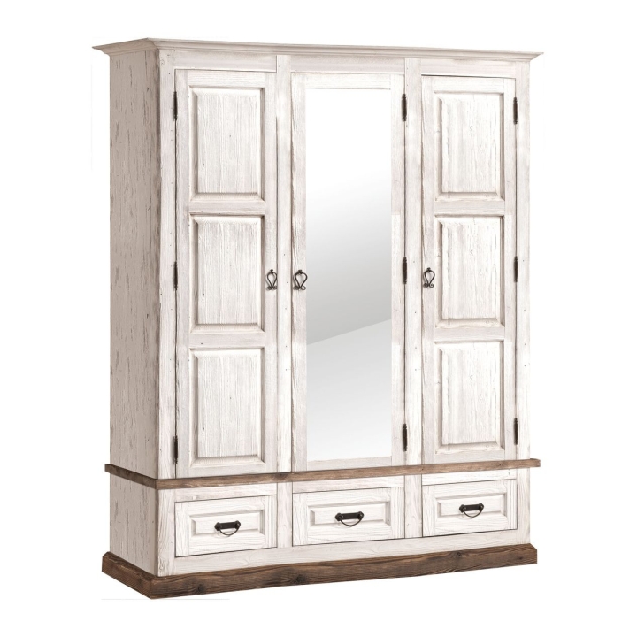 TheProvance 3-door wardrobe with mirror is an elegant Provencal style piece of furniture, which perfectly combines functionality with aesthetics. Made of high quality materials, it ensures solidity and durability, and its white, aged finish gives it a unique, vintage character. The wardrobe has three doors, one of which is fitted with a large mirror, which not only adds charm but also optically enlarges the space, bringing more light into the interior. At the bottom of the wardrobe there are three drawers, which are ideal for storing smaller items. The Provance 3-door wardrobe with mirror is not only a beautiful, but also a very practical piece of furniture. Its well-thought-out design and large capacity make it ideal for a bedroom or wardrobe, helping to keep things tidy and organised.