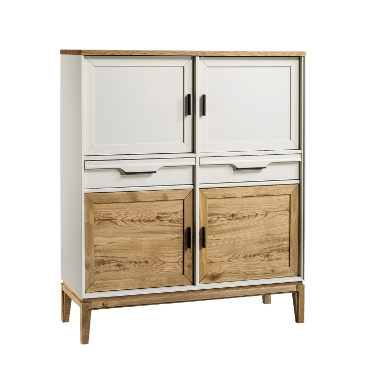 The Granada GRA.040 chest of drawers is a combination of traditional and modern accents in furniture design. The unique character of the chest of drawers is due to the use of oak veneers from historic logs, which create unique patterns on the surface of the furniture. The innovative milling in the wooden parts blends perfectly with the contrasting anthracite lacquered details. The colour scheme of desert grey, a mixture of grey and beige, adds to the originality of the furniture. Thanks to its well-thought-out design and functional solutions, the Granada GRA.040 chest of drawers will become a perfect addition to the living room or dining room, encouraging you to spend time in a warm, family atmosphere. Slides and hinges: self-closing. Available in: 05 Anthracite lacquer or 09 Desert Grey lacquer