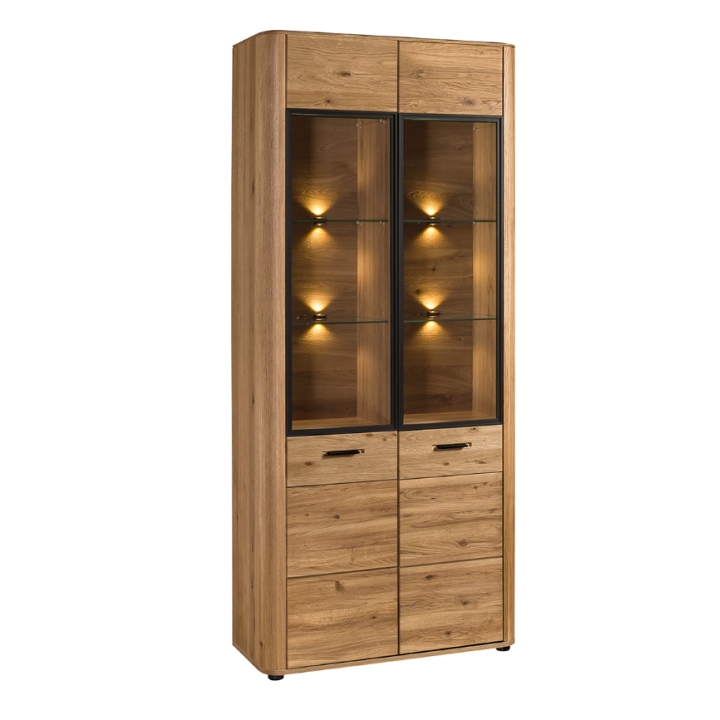 Moreno display cabinet is an ideal piece of furniture for both the living room and the dining room thanks to a large number of shelves, which are able to accommodate a myriad of various trinkets and decorations. It is a sensational piece of furniture for storing home textiles or tableware in the dining room. The glass front is perfect for displaying souvenirs. Made of natural veneer with solid wood elements guaranteeing the highest quality, precision and craftsmanship, which will stay with us for many years. Another advantage are the guides and hinges with a self-closing mechanism. LED lighting adds a modern touch and the brown handles and frames create a beautiful contrast with the natural colour of the wood. The simple shape is completely in line with the latest interior design trends and the long handles guarantee excellent convenience in everyday use.