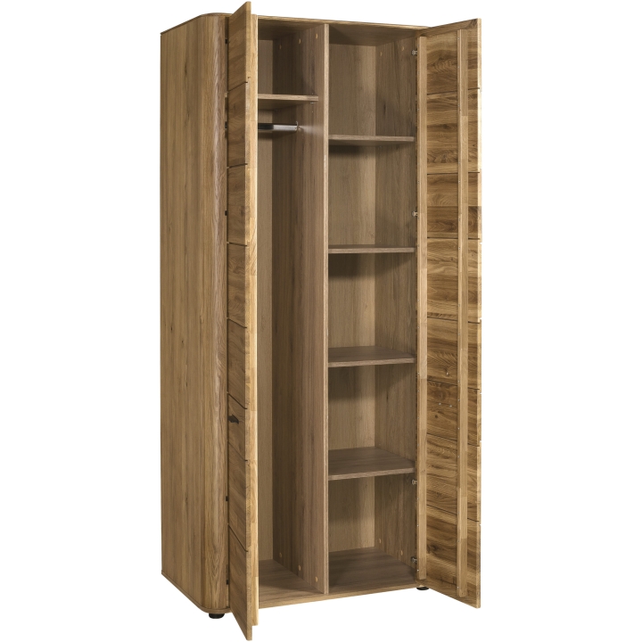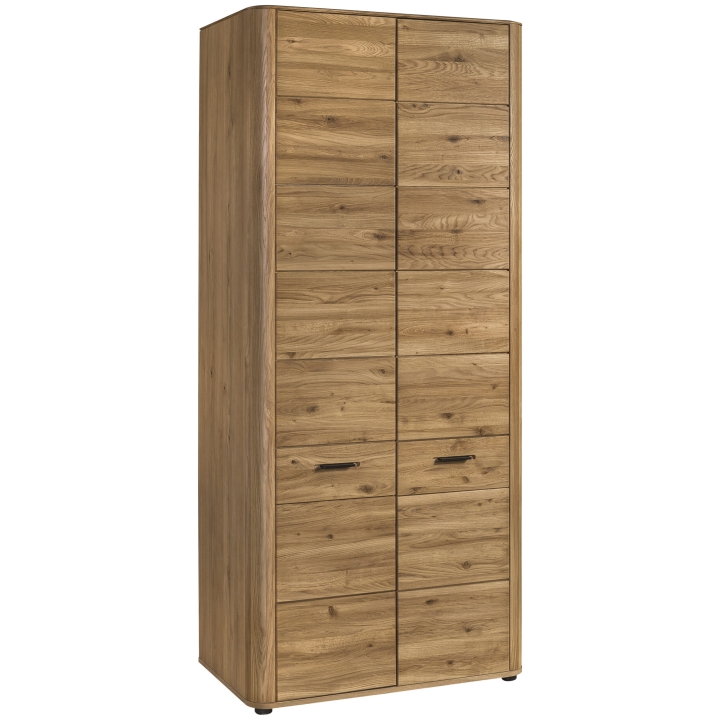 Moreno display cabinet is an ideal piece of furniture for both the living room and the dining room thanks to a large number of shelves, which are able to accommodate a myriad of various trinkets and decorations. It is a sensational piece of furniture for storing home textiles or tableware in the dining room. The glass front is perfect for displaying souvenirs. Made of natural veneer with solid wood elements guaranteeing the highest quality, precision and craftsmanship, which will stay with us for many years. Another advantage are the guides and hinges with a self-closing mechanism. LED lighting adds a modern touch and the brown handles and frames create a beautiful contrast with the natural colour of the wood. The simple shape is completely in line with the latest interior design trends and the long handles guarantee excellent convenience in everyday use.