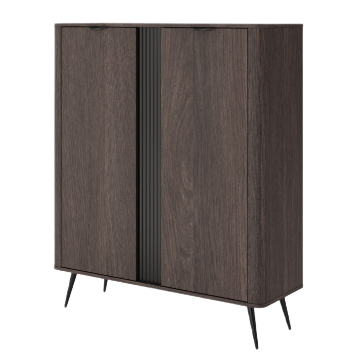 Behind its two front doors, you’ll find two roomy cabinets, each fitted with two adjustable shelves, providing four separate storage compartments ideal for books, textiles, or everyday accessories. The central black grooved panel on the front adds a decorative accent that breaks up the smooth oak surface and gives the furniture a unique, designer look.