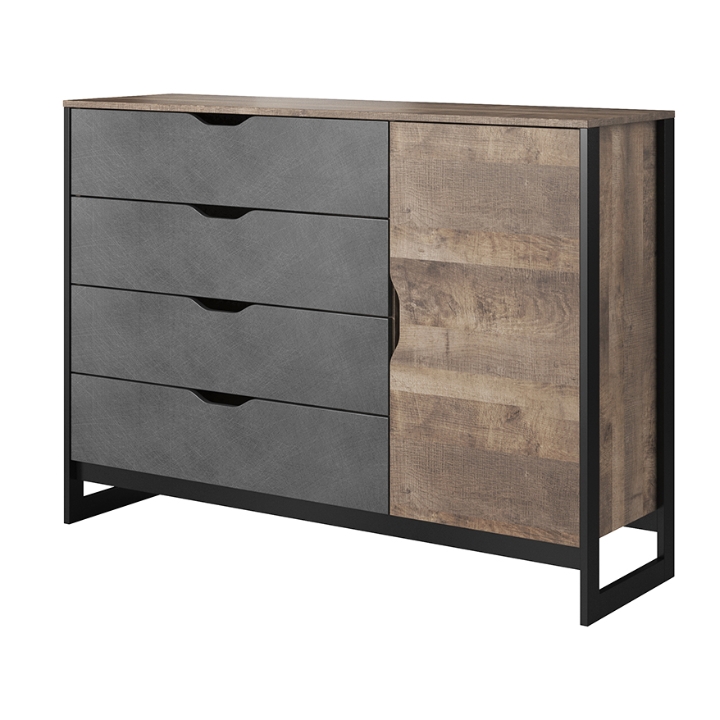 The Arden 138 D4S Chest of Drawers by Laski Meble, measuring 99 cm in height, 138 cm in width, and 40 cm in depth, perfectly combines functionality with a distinctive industrial aesthetic. This piece helps organize space in your living room, bedroom, or home office, while bringing a touch of modern minimalism to the interior.