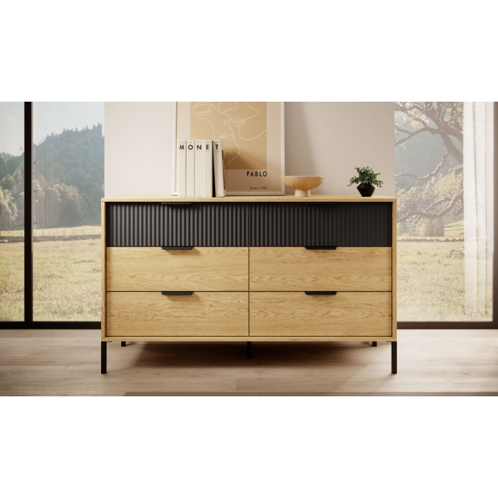 The top pair of drawers stands out with black ribbed fronts, introducing texture and a bold visual accent. The remaining four drawers display smooth fronts in a light Baltic oak tone, providing a natural contrast and visual balance.