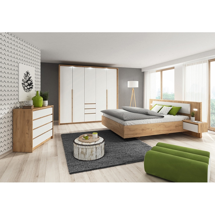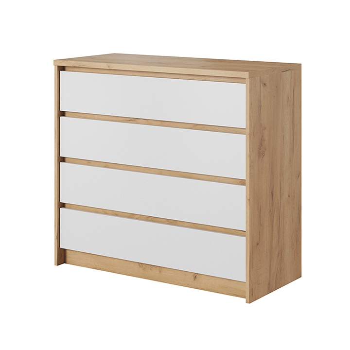 The combination of white matte fronts with Golden Craft Oak décor creates a warm, natural tone that brightens the room and adds a welcoming atmosphere. Crafted from durable furniture board, the chest guarantees long-lasting stability and an impeccable appearance over the years.