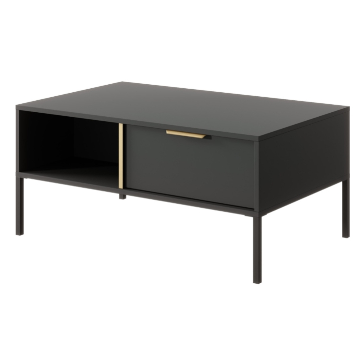 The Lars Coffee Table by Laski Meble brings a modern touch to any living room, combining a minimalist form with striking details. The smooth, rectangular anthracite tabletop seamlessly integrates with the body, while gold accents—including the decorative ABS edging and metal handles—add a hint of luxury and highlight the attention to craftsmanship.