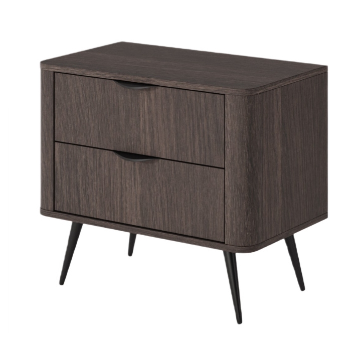 Beneath the tabletop, there are two drawers – perfect for keeping books, glasses, or small accessories within reach. The wood-look fronts and body are complemented by black metal details – sleek handles and slim legs add lightness and contrast to the design.