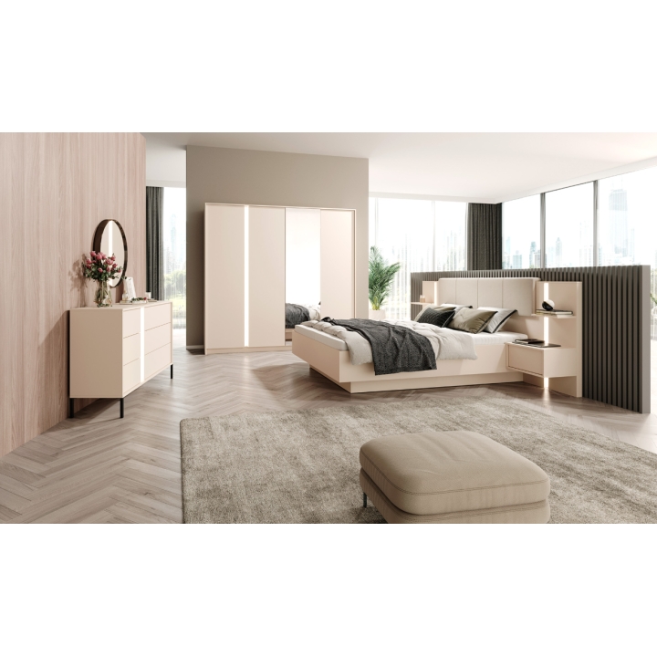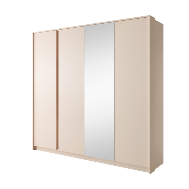 The Dast 220 wardrobe by Laski Meble, measuring 210 cm in height, 223 cm in width, and 55 cm in depth, is a four-door model where minimalist design meets high functionality. Both the body and fronts are finished in a subtle sandy beige tone, making it easy to blend into various interior arrangements.