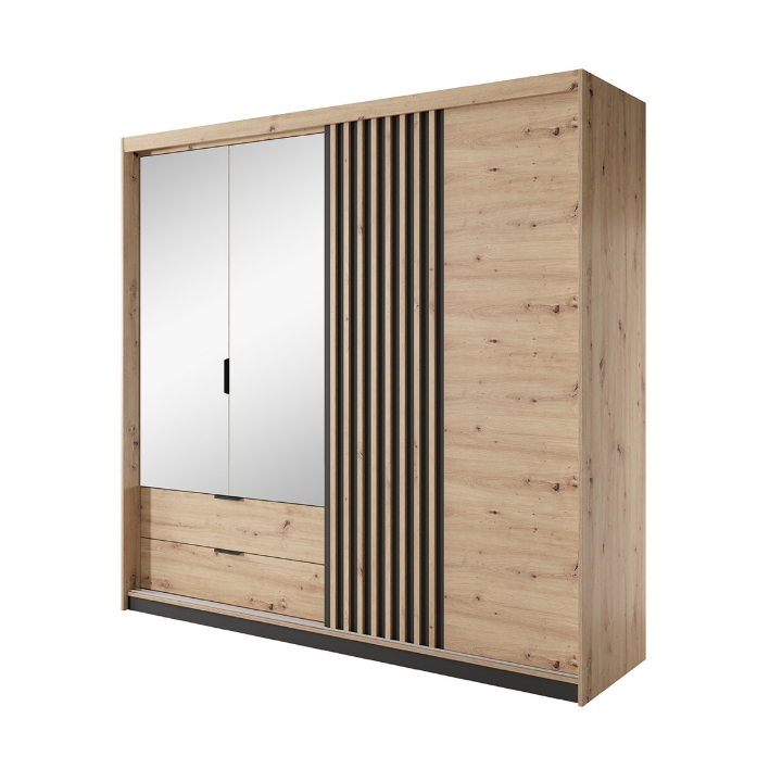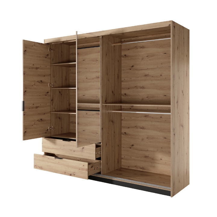 The central part of the wardrobe features wide doors in a smooth artisan oak finish, with decorative slats on one of the fronts. Inside, there is a large shelf and two hanging rails that allow for easy storage of clothes on hangers. The varied interior makes it simple to store both everyday wear and special occasion outfits.