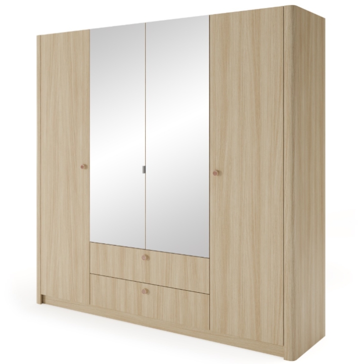 This four-door wardrobe is divided into two side compartments and a central section. On each side, tall full-height doors open to reveal four practical shelves, perfect for neatly organizing clothes, linens, or textiles. The middle section, designed differently, features two mirrored doors that visually enlarge the room and reflect more light. Behind them, you’ll find a wide shelf and a hanging rail for clothes.