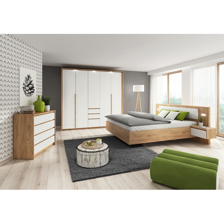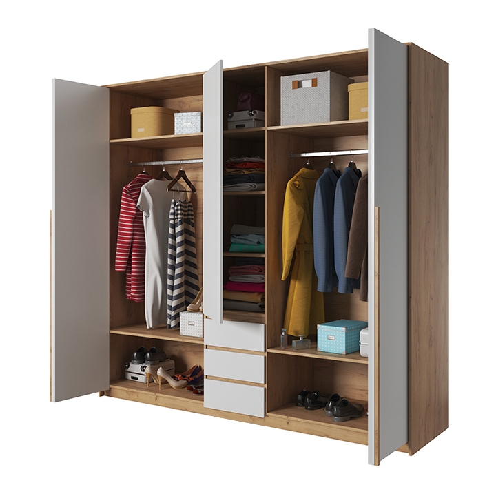 The color combination of white matt fronts with a golden craft oak body gives the furniture a subtle yet elegant appearance, making it easy to integrate into various interior designs. The wardrobe is also available with LED lighting, which enhances its aesthetic appeal and improves visibility during evening use.