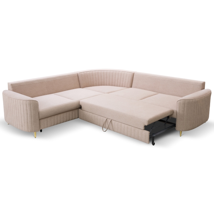 The Laski Meble Laren corner sofa bed with storage (dimensions: width 255 cm, height 86 cm, depth 255 cm) combines comfort, style, and high-quality craftsmanship. Designed in a glamour aesthetic, it features elegant decorative stitching and gold-finished legs, adding lightness and shine to any living space.