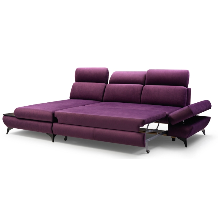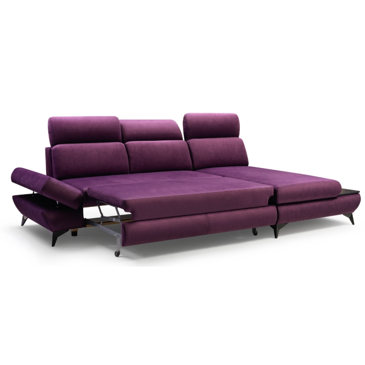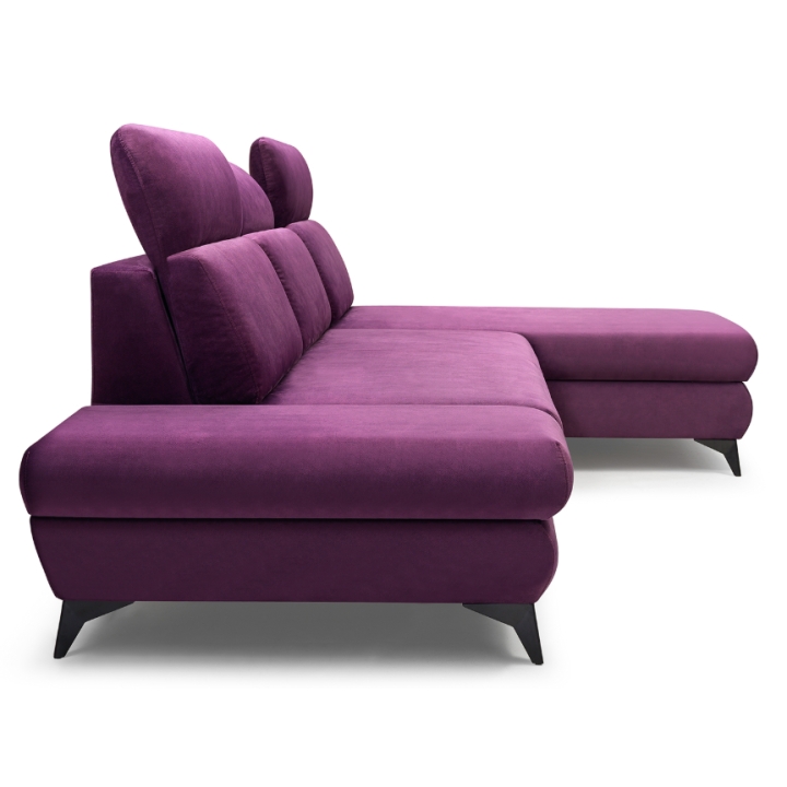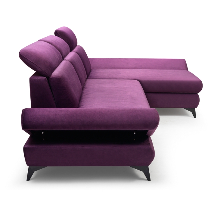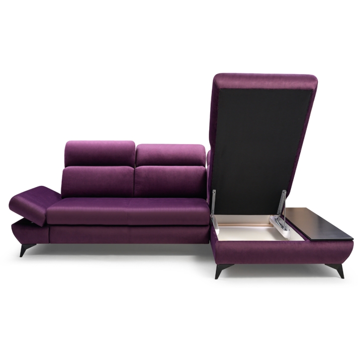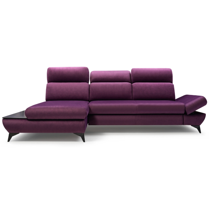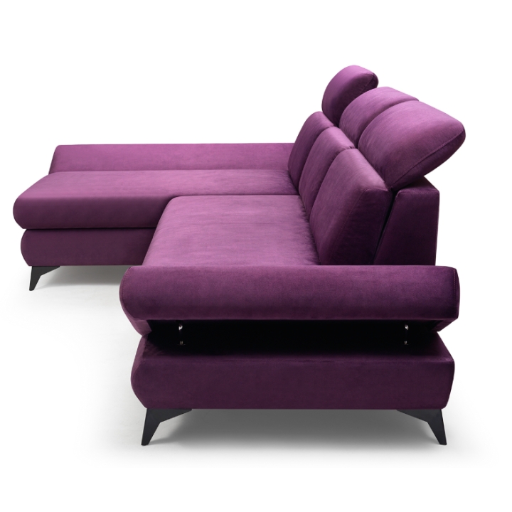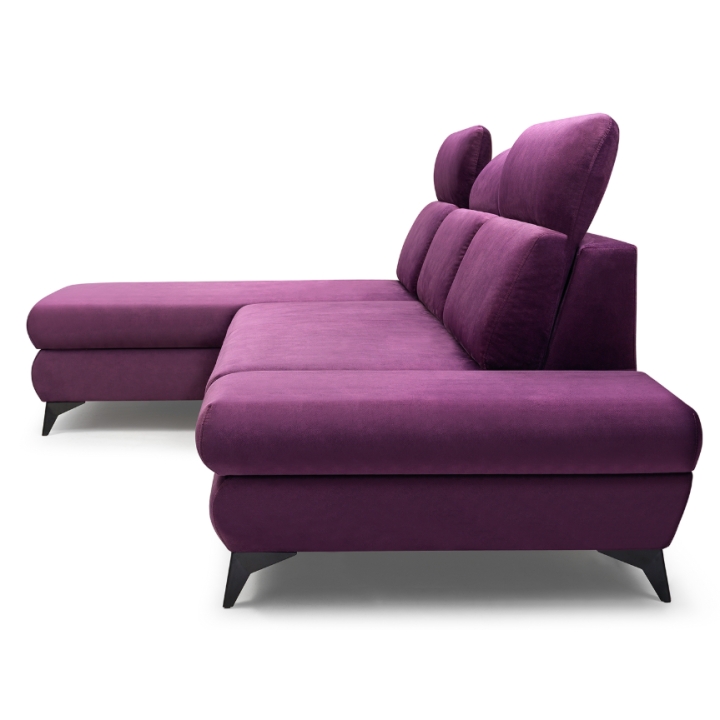 The Titan corner sofa from Laski Meble stands out with its refined details and modern design. Measuring 280 cm wide, 102 cm high, and 166 cm deep, it impresses with sleek black metal legs and a built-in side shelf ideal for small items or decorative accents.