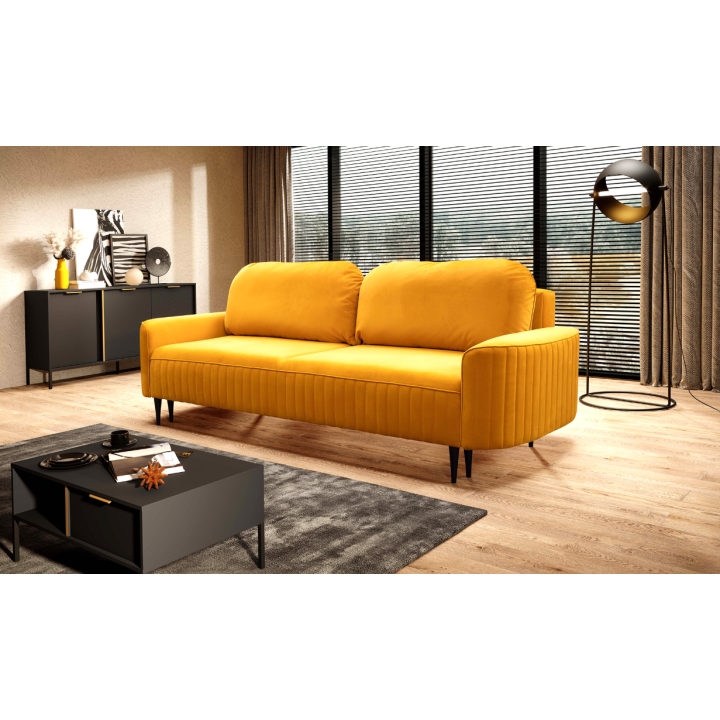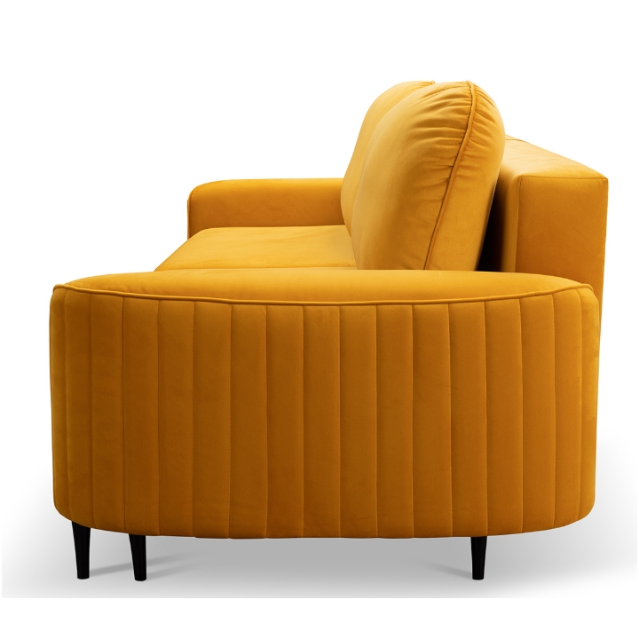 The Vena Sofa by Laski Meble draws attention with its modern design and refined details. Measuring 244 cm in width, 92 cm in height, and 102 cm in depth, it features vertical decorative stitching that enhances its form and adds expressive character. The warm orange upholstery enlivens the room, creating a cozy and inviting atmosphere.