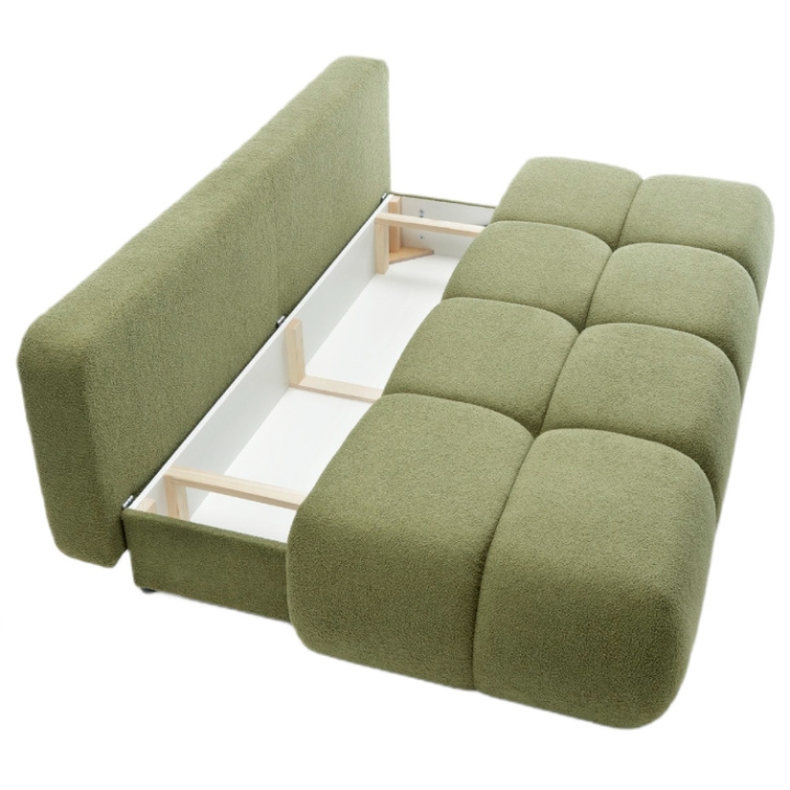 The sofa is equipped with a DL-type sleeping function—simply pull the seat forward and fold down the backrest to create a sleeping area measuring 142×200 cm. The unfolding mechanism works smoothly and effortlessly, making the sofa suitable for both a living room and a guest room. In the lower section, there is a bedding storage compartment, perfect for storing blankets, pillows, or a throw, helping keep the space tidy.