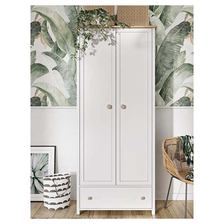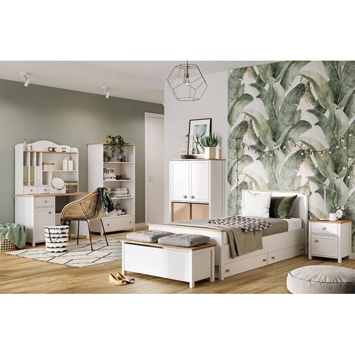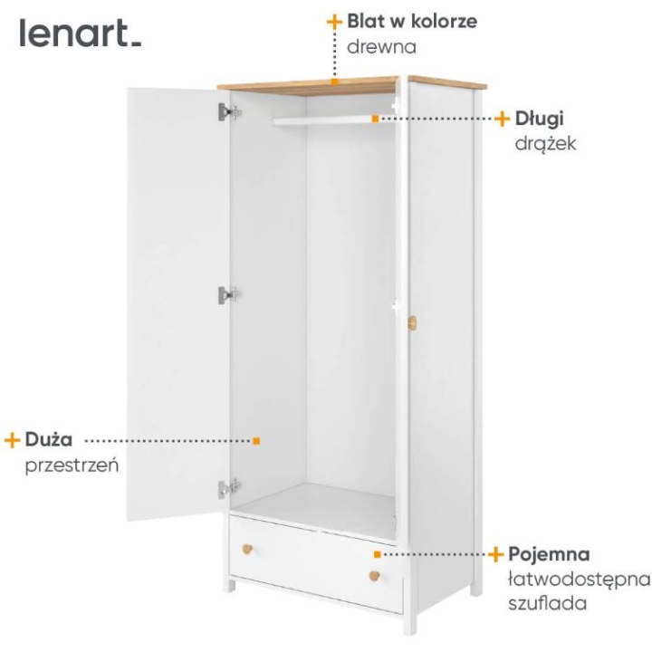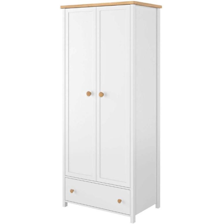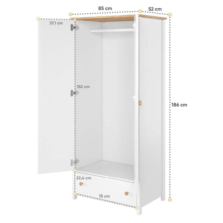 The stylish Story wardrobe, is the perfect solution for youth rooms, bedrooms and dressing rooms, providing a stylish and functional design element. The piece of furniture measures 85 cm wide, 186 cm high and 52 cm deep. With its slim body in white and Nash oak wood imitation detailing, the wardrobe looks unique, perfectly suited to girls of all ages. The interior of the wardrobe has been designed with practicality in mind, incorporating a long clothes rail of varying lengths and a roomy drawer, easily accessible even by children. Additional storage space is also provided under the bar, maximising the use of the space inside the wardrobe. Assembly of the piece of furniture is simple, but guarantees solidity and durability, thanks to its manufacture from durable laminated board with durable ABS edging and plastic handles. The Story wardrobe is not only a practical place to store clothes, but also a distinctive decorative element that will bring a romantic charm to the interior in a modern way.