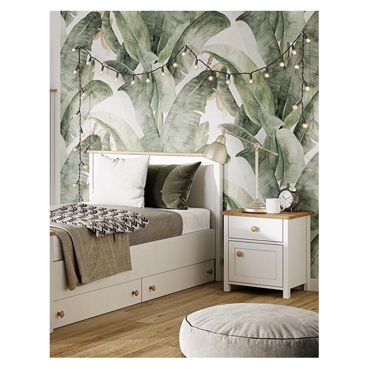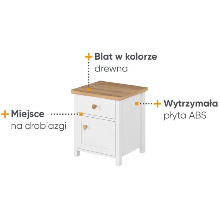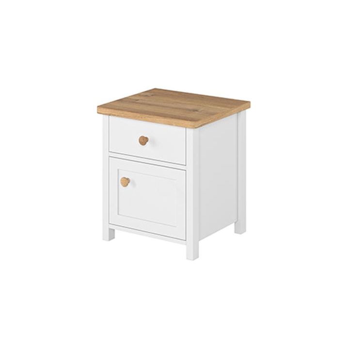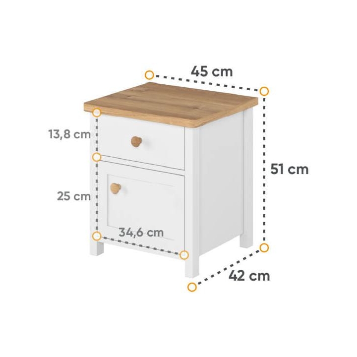 The stylish Story bedside table is an indispensable design element in both the youth room and bedroom. The piece of furniture measures 45 cm wide, 51 cm high and 42 cm deep. Thanks to its functionality, you can store all the necessary trinkets in it, and additionally it will serve as a comfortable top for a reading lamp. The table is equipped with one capacious drawer and a door, which allows you to organise your space effectively. The juxtaposition of elegant white with the warm colour of the Nash oak wood gives the furniture a modern character, which perfectly matches the modern style of the collection. Made from durable laminated board with durable ABS edging and plastic handles, the bedside table guarantees solidity and durability. Assembly of the furniture requires assembly, however, this is an easy task to perform. The end result is a practical and stylish bedside table that will perfectly complement any interior, adding elegance and functionality.