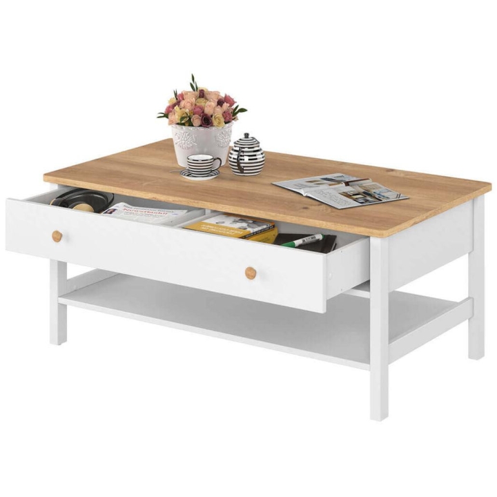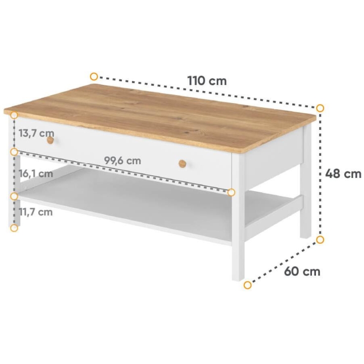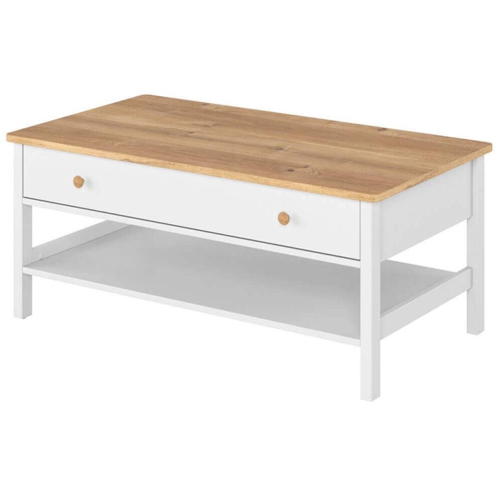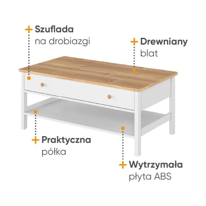 The stylish Story coffee table is an extremely functional piece of décor, ideal for the youth room, living room and bedroom. The furniture measures 110 cm wide, 48 cm high and 60 cm deep. The juxtaposition of elegant white with the warm colour of the Nash oak wood gives the furniture an original character, which will delight lovers of classic style interiors. Under the stylish table top there is a practical drawer, ideal for small items, while the lower shelf provides additional storage space. Made of durable laminated board with durable ABS edging and plastic handles, the coffee table guarantees solidity and durability. The furniture needs to be assembled, but this is an easy task to complete. The end result is a functional and stylish table that will perfectly complement any interior, adding elegance and cosiness.