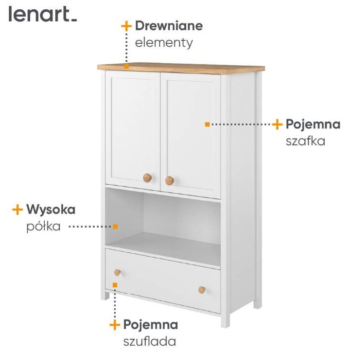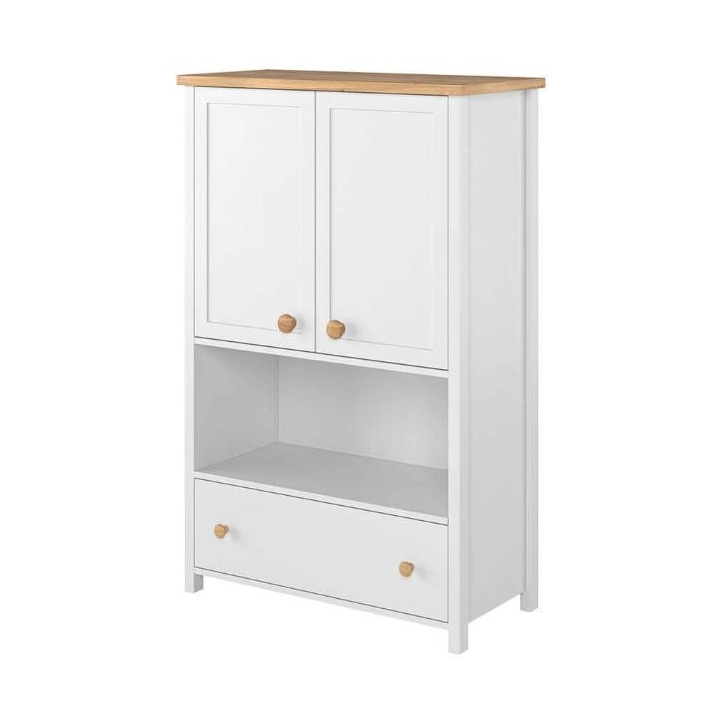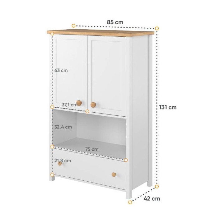 The stylish Story chest of drawers is a functional solution for any modern interior, ideal whether for a youth room, bedroom or dressing room. Measuring 85 cm wide, 131 cm high and 42 cm deep, the furniture gives it an original character by juxtaposing elegant white with the warm colour of Nash oak wood. It has two stylish and easy-to-open doors, ideal for storing a variety of items, and a convenient drawer for linen or trinkets. In addition, a shelf located halfway up the chest of drawers can be used as a place for books or decorations, adding functionality to the furniture. It is made of durable laminated board with durable ABS edging and plastic handles, ensuring durability and ease of maintenance. The furniture requires assembly, but the end result is a stylish and practical chest of drawers that will perfectly complement any interior, adding elegance and functionality.