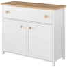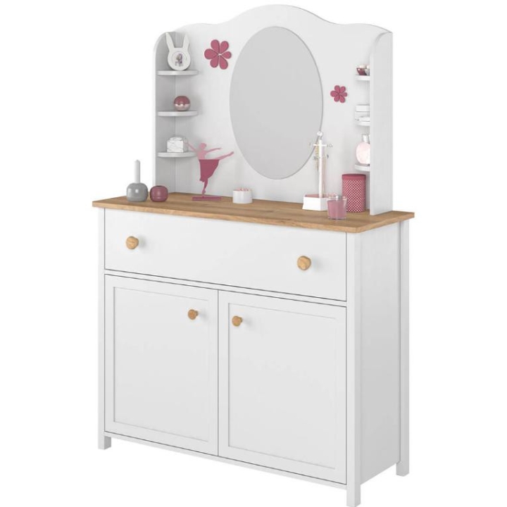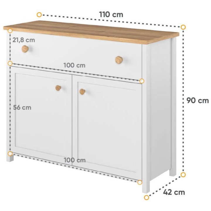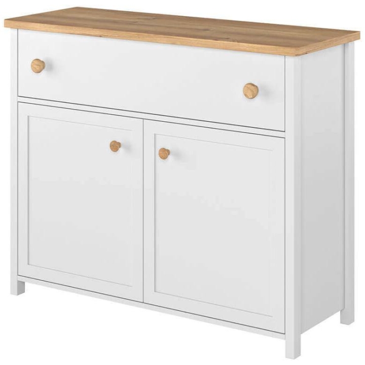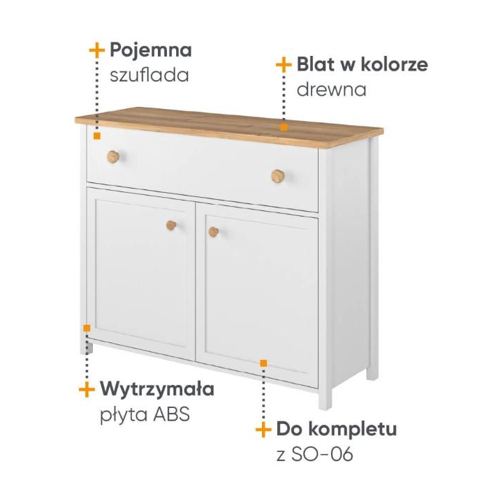 The stylish Story chest of drawers is the perfect solution for any modern interior, ideal whether for a youth room, bedroom or dressing room. Measuring 110 cm wide, 90 cm high and 42 cm deep, the furniture's juxtaposition of elegant white with the warm colour of the Nash oak wood gives it an original and unique character. It has two capacious spaces behind the doors and an easily accessible drawer, ideal for storing linen or other small items. The chest of drawers can be completed with an extension in the form of a dressing table (SO-06) with a mirror and additional shelves, which will make it even more functional. It is made of durable laminated board with durable ABS edging and plastic handles, ensuring durability and ease of maintenance. The furniture needs to be assembled, but the end result is an elegant and practical chest of drawers that will not only become a functional piece of furniture, but also a decoration for any room.