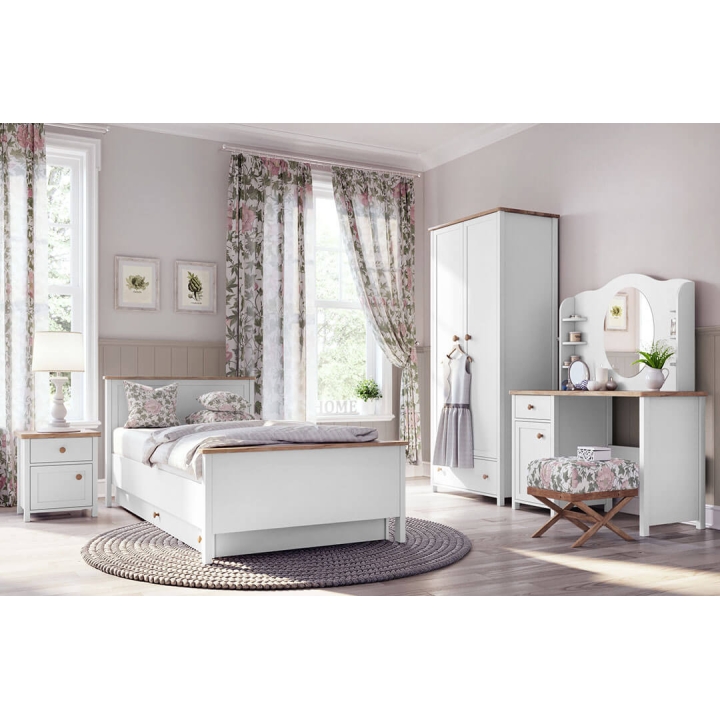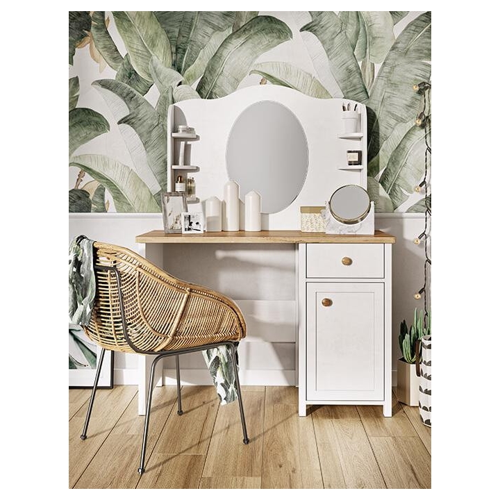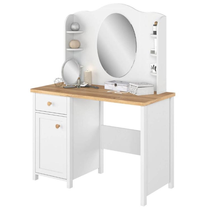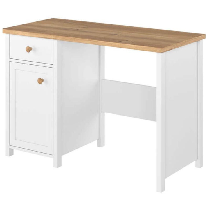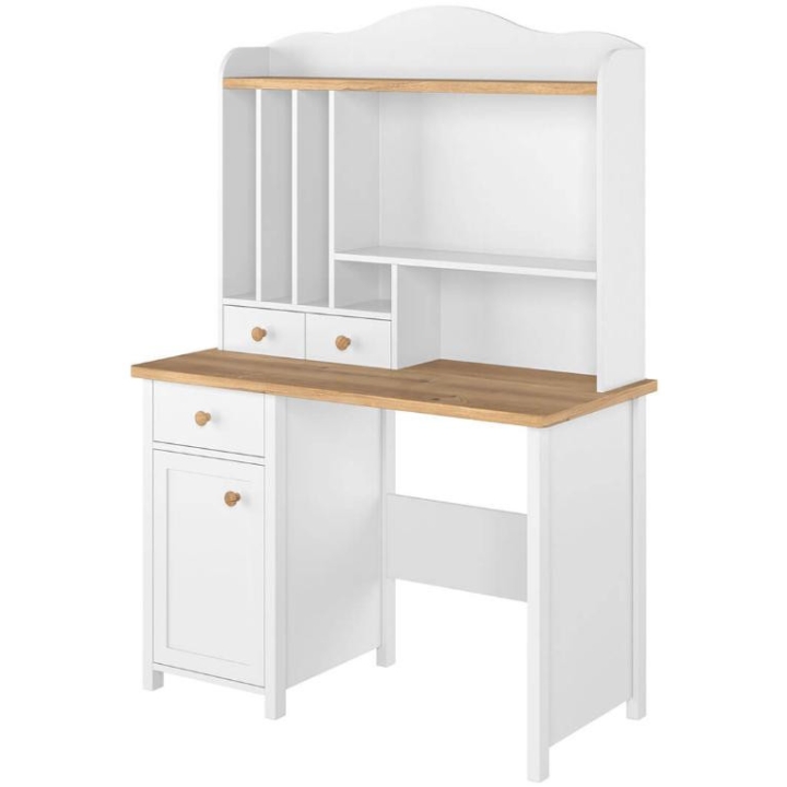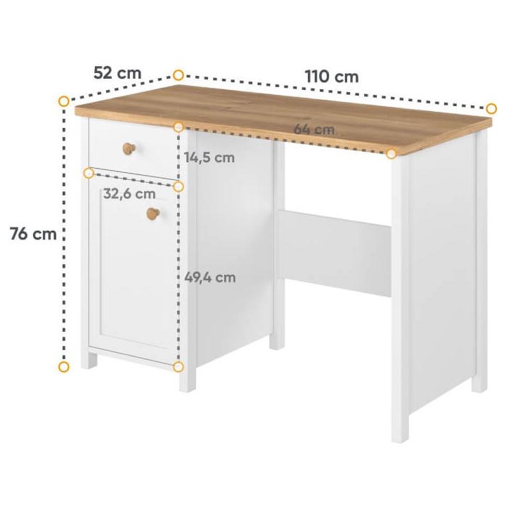 The comfortable Story desk is the ideal solution for a youth room or bedroom, providing space for studying and working. The classic, modern style of the furniture is characterised by the combination of the white form with the warm colour of the Nash oak wood, giving the interior elegance and subtle charm. With an ergonomic top measuring 110x52 cm, the 76 cm high table offers plenty of space for studying, drawing or artwork. A cabinet with doors and one drawer provides additional storage space for small items. The option to buy an extension in the form of a secretary with compartments and drawers (SO-04) or a dressing table with a mirror and shelves (SO-06) allows you to adapt the desk to your individual needs. Made of durable laminated board with durable ABS edging, with plastic handles, it guarantees durability and ease of maintenance. The furniture requires assembly, but the end result is an elegant and practical desk that is sure to meet the expectations of even the most demanding users.