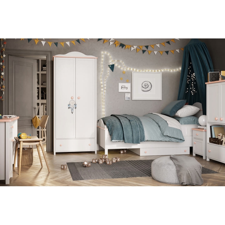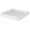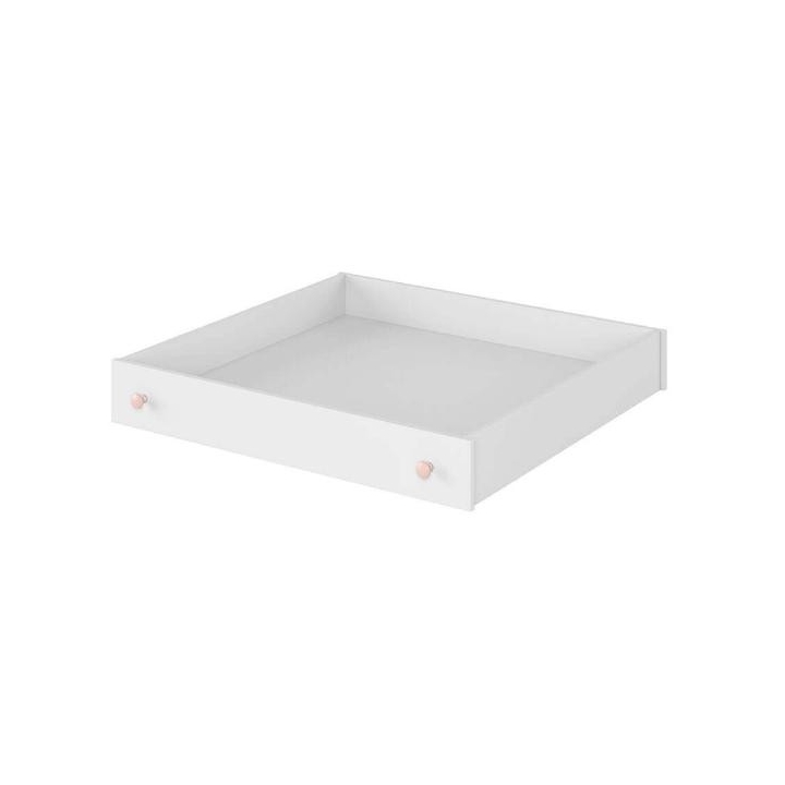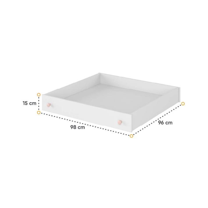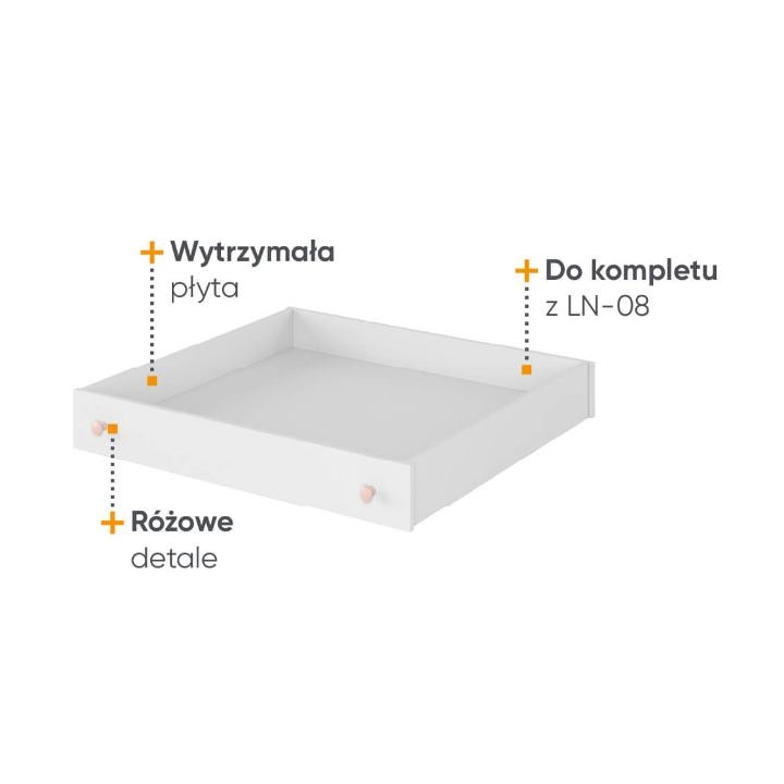 A functional bedding drawer in an elegant white and pink colour scheme, perfectly suited to a youth room. It perfectly matches the LN-08 bed, creating a neat set for storing bedding, blankets and other essential accessories. Thanks to its dimensions - 98 cm wide, 15 cm high and 96 cm deep - it will fit perfectly under the LN-08 bed, saving valuable space in the room. Assembling the drawer is easy, and being made of durable laminated board with durable ABS edging guarantees not only a modern look, but also high quality.