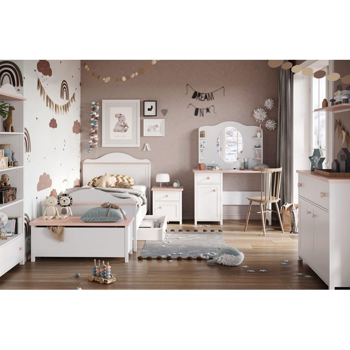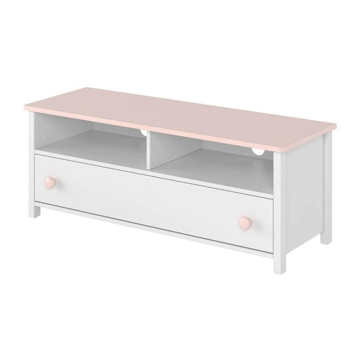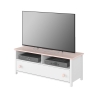 The functional Luna RTV cabinet with two versatile recesses for electronic equipment and a capacious, deep drawer is the perfect solution for a modern youth room. Its elegant design in white with delicate accents of pink adds a charming touch to the interior, while at the same time ensuring adequate functionality. With a width of 120 cm, a height of 46 cm and a depth of 42 cm, it fits perfectly into the space under the TV while offering space for storing various items. The furniture is easy to assemble and its solid construction ensures durability and comfort for years to come.