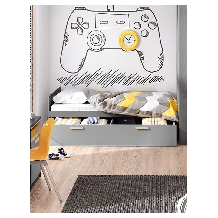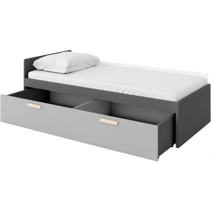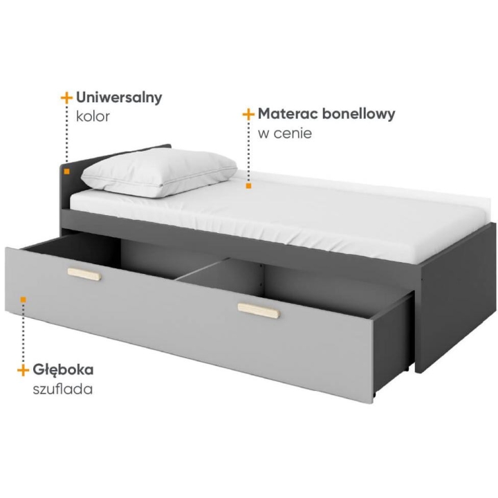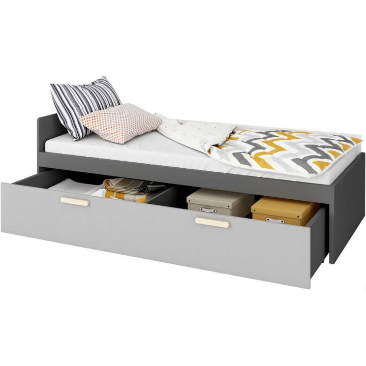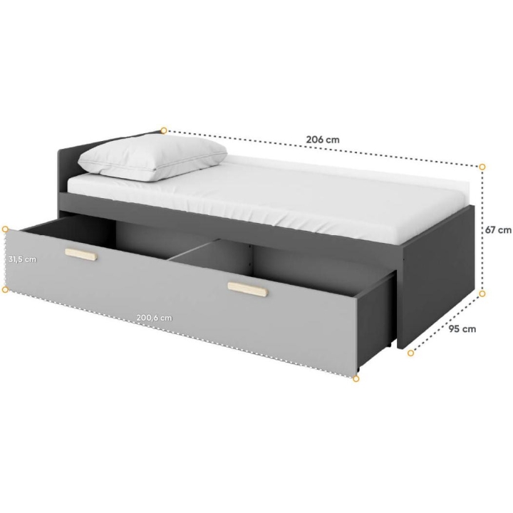 The Pok wheeled drawer, dedicated to the model PO-13 bed, is the ideal solutionfor storing bedding, blankets and other items. The dimensions of the furniture, 200 cm wide, 32 cm high, 83 cm deep, provide ample capacity. Assembly of the furniture requires little effort. The style of the collection is dominated by modern accents, and the colour scheme in shades - light grey, graphite - give it versatility and ease of matching to different interiors. Made from durable laminated board, ensuring a sturdy construction. Ideal for a youth room, harmoniously combining functionality and aesthetics. Handles made of beech wood.