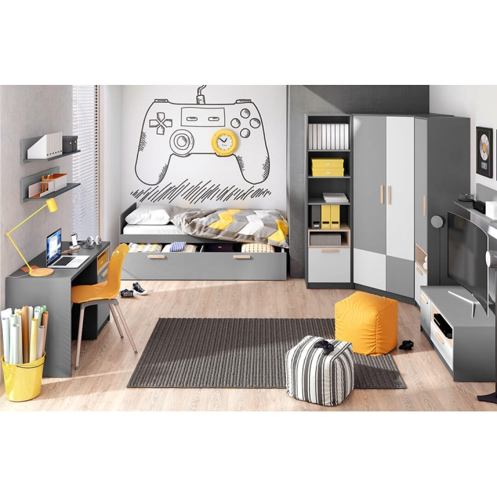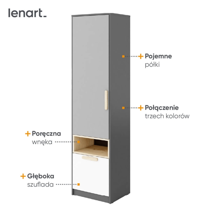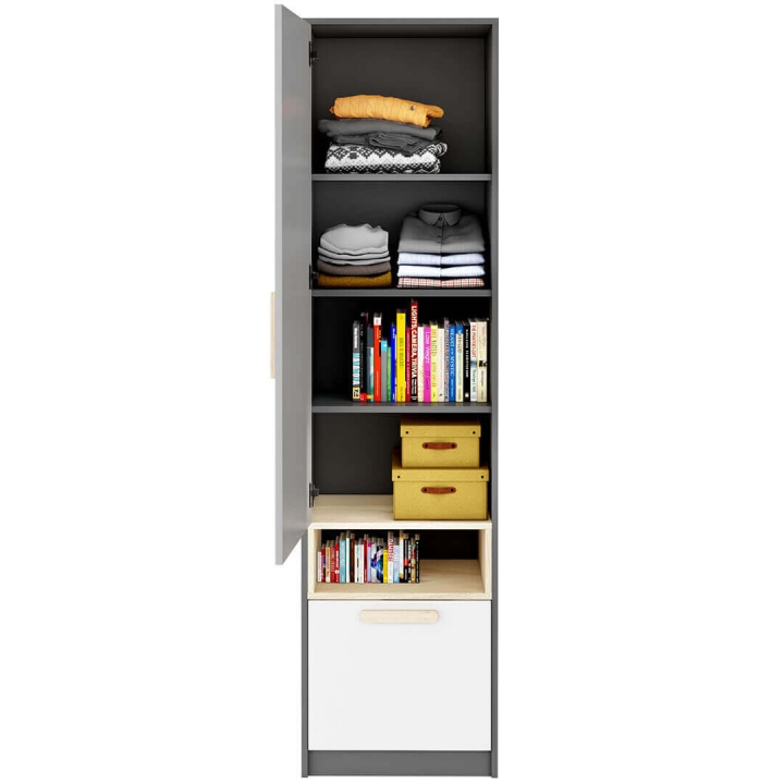 The compact, single-door Pok wardrobe with an elegant design is ideal for a youth room. It has 5 capacious shelves and a deep drawer, providing plenty of space to store clothes, toys and school accessories. The furniture's dimensions are 50 cm wide, 193 cm high and 40 cm deep. In addition, a recess for small items makes it easy to keep things tidy. The colour scheme in shades of light grey, graphite and white gives the wardrobe a modern look that is easy to match with different interiors. Made of durable laminated board, with solid beech wood handles, it ensures durability and stability. Assembling the furniture requires little effort, thanks to the simple instructions.