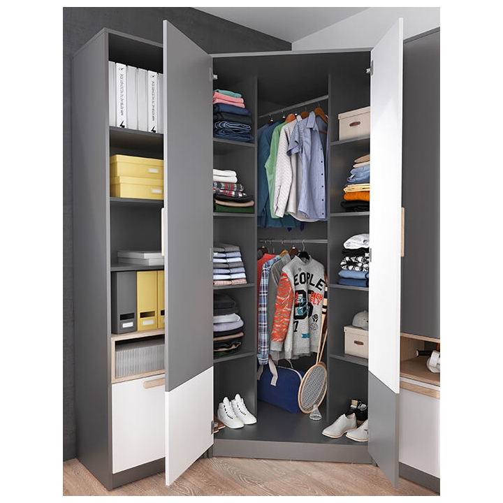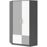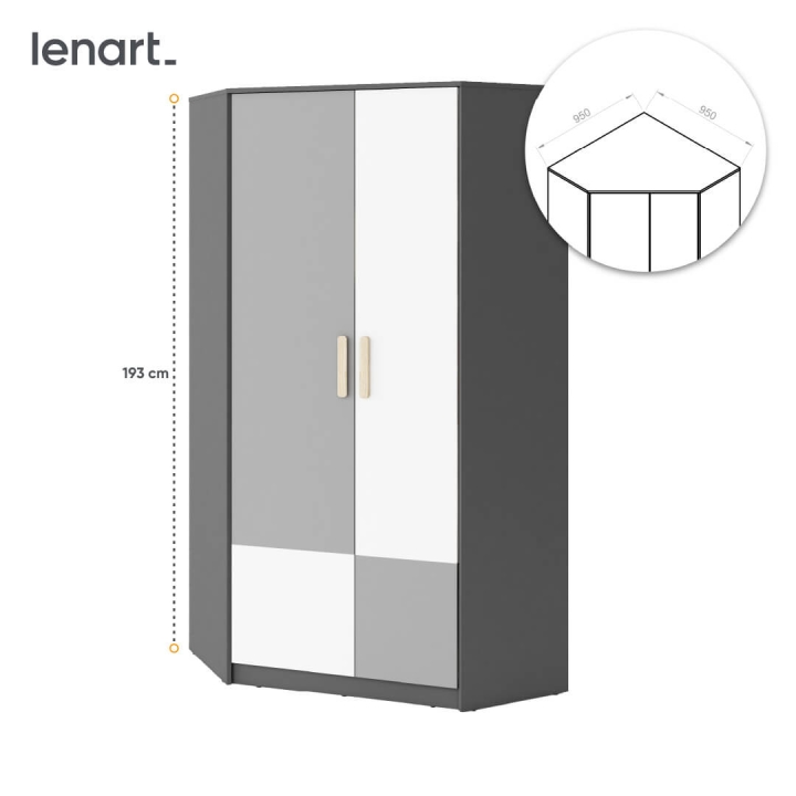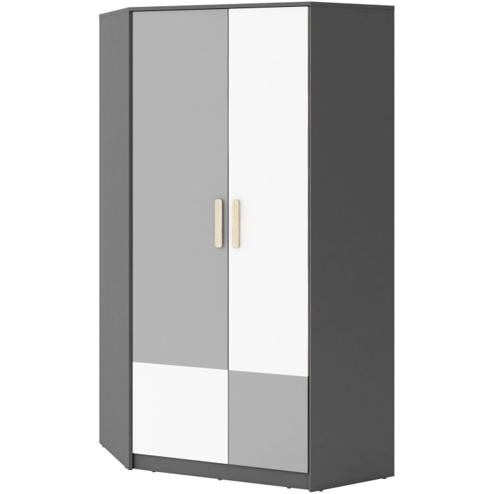 The large and capacious Pok corner wardrobe is a piece of furniture with plenty of storage space. Ideal for children' s and teenagers ' rooms, it is also perfect for use in siblings' rooms. The dimensions of the wardrobe are: width 95 cm, height 193 cm, depth 95 cm. Inside, there are two hanger rods and two internal shelves with capacious shelves, providing adequate organisation of space for clothes and accessories. Additional space at the bottom of the wardrobe allows for storage of suitcases, shoes and smaller sports equipment. The wardrobe is made in a modern style, made of durable laminated board, and the combination of colours - light grey, graphite and white - gives it a modern look. The furniture requires assembly, which should not cause any problems. The handles are made of beech wood.