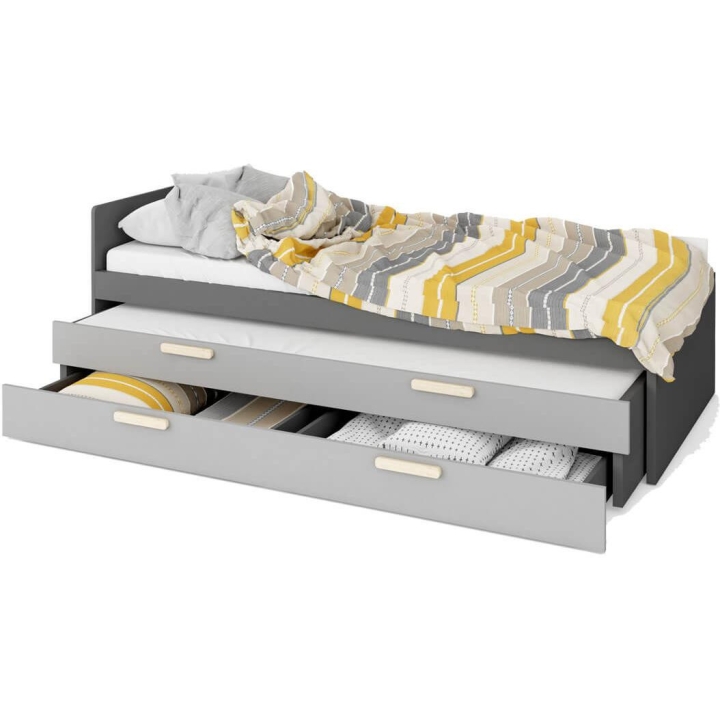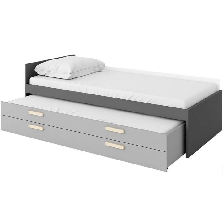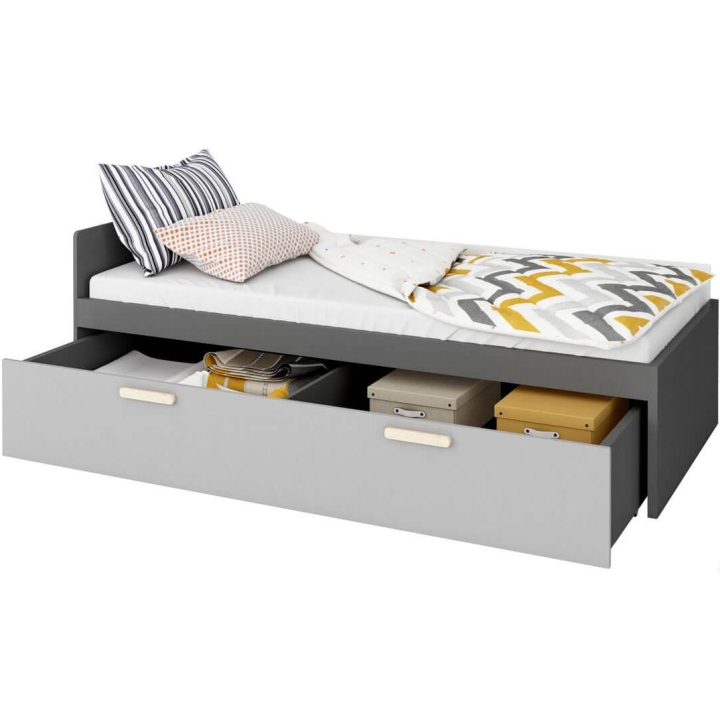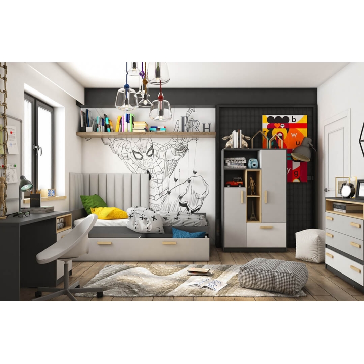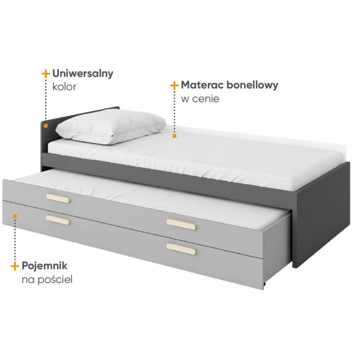 The fashionable and functional Pok bed for children and teenagers is a solution that fits perfectly into the modern design of the room. Thanks to the universal combination of colours - graphite, Ibsen beech, light grey and white - the bed is easy to match with different interior designs. The bed's dimensions are 206 cm wide, 67 cm high and 95 cm deep, and its comfortable shape ensures a comfortable night's sleep. Constructed from durable laminated board finished with ABS edging for robustness and durability. The bed offers practical storage solutions thanks to the optional drawers, which are ideal for storing bedding, an extra mattress or other items. Easy assembly makes it ideal for any youth room. The bed is sold with a comfortable mattress.