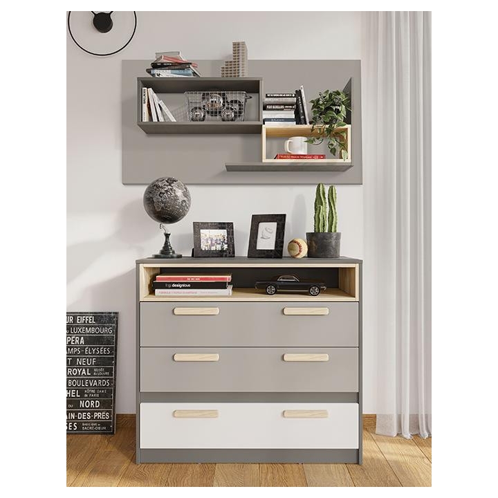 The capacious and practical Pok chest of drawers, in a modern style, is the perfect solution for a youth room. Equipped with three capacious drawers, it provides convenient storage for linen and other essential items. With a width of 100 cm, a height of 90 cm and a depth of 40 cm, the furniture has a deep recess under the top for storing things you always want to have quick access to. The combination of three colours - light grey, graphite and white - gives the furniture a modern look that goes well with a variety of interior designs. The details add cosiness and warmth. The chest of drawers is made of durable laminated board, which guarantees its durability, and ABS edging provides an aesthetic finish. The handles are made of beech wood , which adds elegance and style to the furniture. Assembly of the furniture is extremely simple and does not require much time.