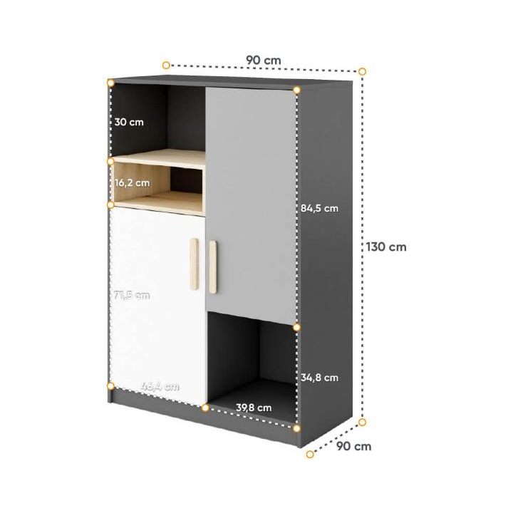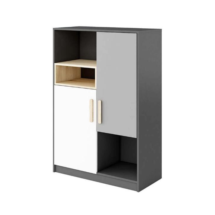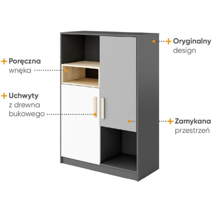 The original Pok chest of drawers, which allows you to conveniently store a variety of items, is a piece of furniture measuring 90 cm wide, 130 cm high and 40 cm deep. On the four shelves you will find space for books, including those of a larger format, such as atlases or school accessories. The lower space, decorated with woodgrain décor, can accommodate smaller items and decorations. The combination of three colours - light grey, graphite and white- gives the furniture a modern look that easily adapts to different interiors. The wood-coloured details add cosiness and warmth. The chest of drawers is made of durable laminated board. The handles are made of beech wood.