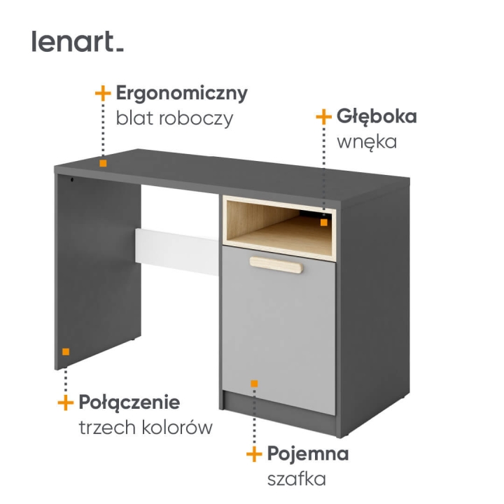Dedicated to a child's or teenager 's room , the modern Pok desk , 75 cm high, is characterised by its ergonomic design and functionality. The 120 cm wide and 50 cm deep top provides a comfortable space to study and work, while the spacious cabinet with doors allows for storage of school accessories. In addition, there is a deep shelf under the top, ideal for books, notebooks or other necessary items. The desk is distinguished by a modern style based on three colour tones: light grey, elegant graphite and classic white. An additional accent in the form of wood-coloured details adds cosiness and warmth to the furniture. Made of durable laminated board and robust ABS edging, this desk guarantees not only a stylish look, but also long-lasting usability. The handle is made of beech wood