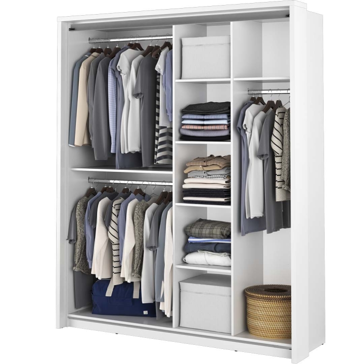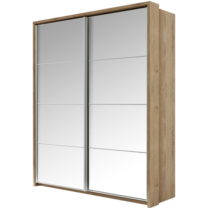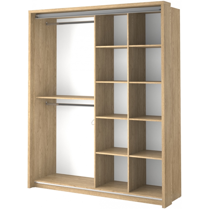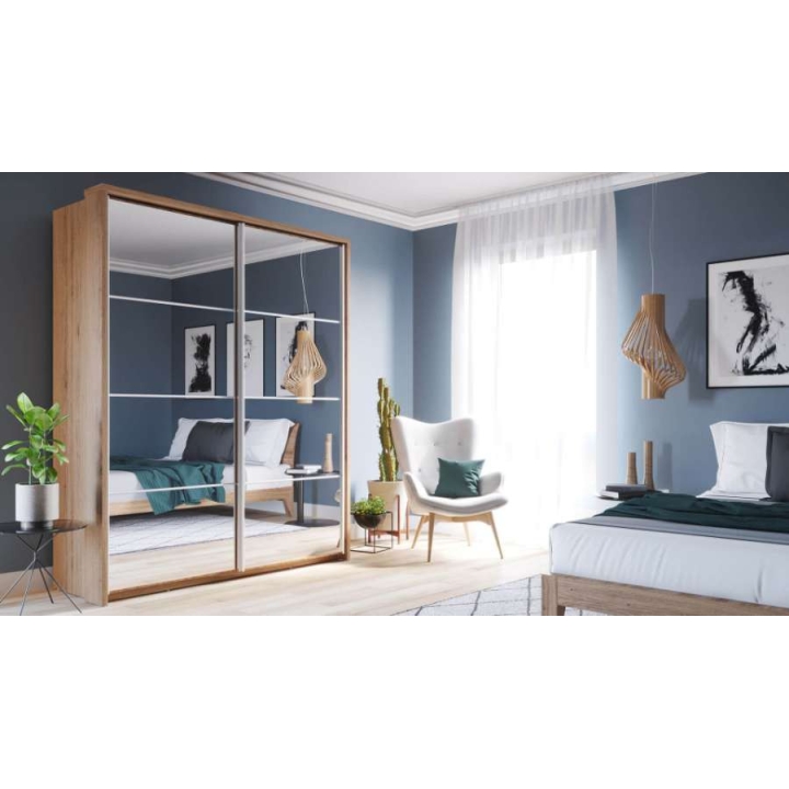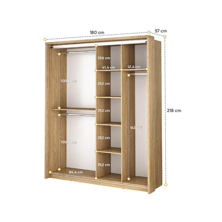 Measuring 180 cm wide, 218 cm high and 57 cm deep, the capacious wardrobe is the ideal solution for a dressing room or bedroom. Built from high quality materials, it guarantees durability and functionality for years to come. The wardrobe has been designed in a modern style, which allows it to fit versatilely into different interior arrangements. Thanks to the two sliding doors, the use of the furniture is convenient even when space is limited. Large panels of mirrors on the fronts optically enlarge the room, adding brightness and elegance. The interior of the wardrobe is equipped with three hanger rods, allowing clothes of different lengths to be hung, and five capacious shelves, ideal for storing a variety of accessories. Available in two colours, the furniture can be tailored to individual aesthetic preferences. Sturdy construction made of laminated board with durable ABS edging ensures stability and durability. The furniture can be retrofitted with atmospheric LED lighting. This functional and stylish wardrobe is an indispensable solution for anyone who appreciates elegance and organisation in their interior. The furniture is available in 2 colour variants: white and shetland oak.